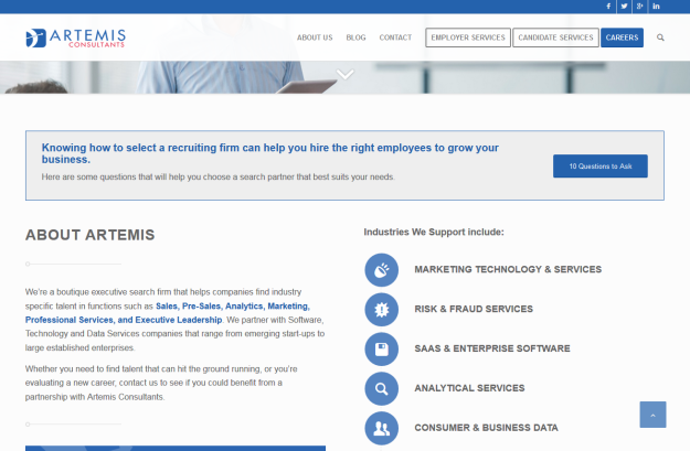 Artemis Consultants is a boutique executive search firm that helps companies find industry specific talent in functions such as Sales, Pre-Sales, Analytics, Marketing, Professional Services, and Executive Leadership.